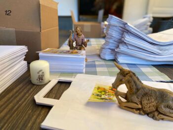 Während ich den restlichen Tag auf dem Sofa verbracht habe – ich muss mich wirklich schonen – waren Esel und Josef fleißig. Für die Weihnachtsgottesdienste wurden Tüten gepackt. Aufgrund von Corona musste man sich für die Gottesdienste an Heiligabend anmelden. Für alle, die keinen Platz in der Kirche mehr bekommen, gibt es eine solche Tüte als kleinen Trost. Insgesamt haben die beiden geholfen 200 Tüten zu packen. Auf jede Tüte musste zunächst ein Aufkleber angebracht werden und dann mit einem Umschlag, einer Kerze und einer Weihnachtskarte gefüllt werden. Und das 200-mal, das war eine Menge Arbeit…